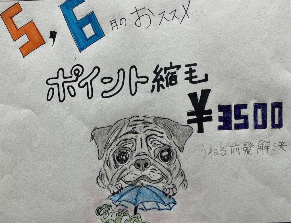 いつもありがとうございます 桜が早かったせいか、あっという間に4月が終わった気がします ぽかぽかな5月です 今月のおススメ 「ポイント縮毛」¥3500 前髪のうねり解決で朝を楽にしてみませんか GWの空き状況 3(日)→午前中空きございます 4(月)→定休日 5(火)→夕方空きございます 6(水)→空きございます お電話お待ちしております